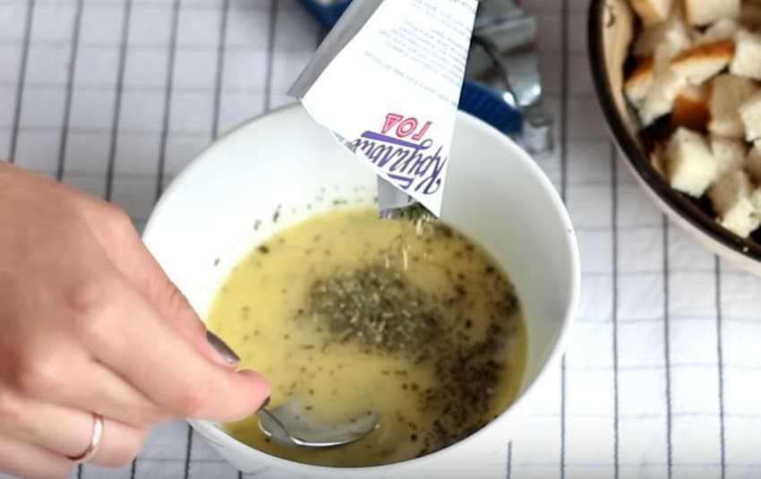 В такой салат традиционно кладут сухарики из белого хлеба. Но рецепт можно улучшить, приготовив сухарики с чесноком и сушеными травами. Они придадут салату пикантный вкус и аромат.