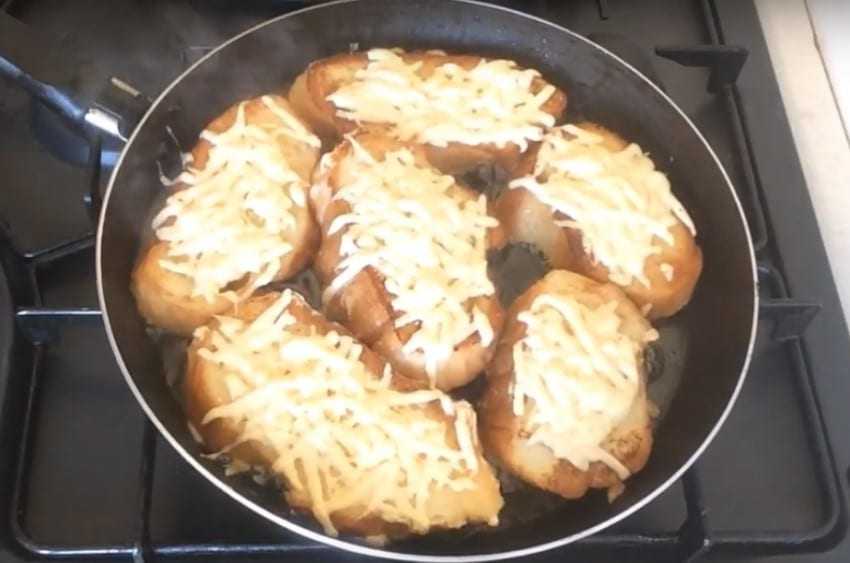 Затем выкладываем на горячую сковороду в разогретое масло кусочки хлеба таким образом, чтобы картошка была наверху. Когда низ будет готов (покроется корочкой), нужно дать поджариться картофелю, но делать это нужно аккуратно и следить, чтобы начинка и батон не разделились.