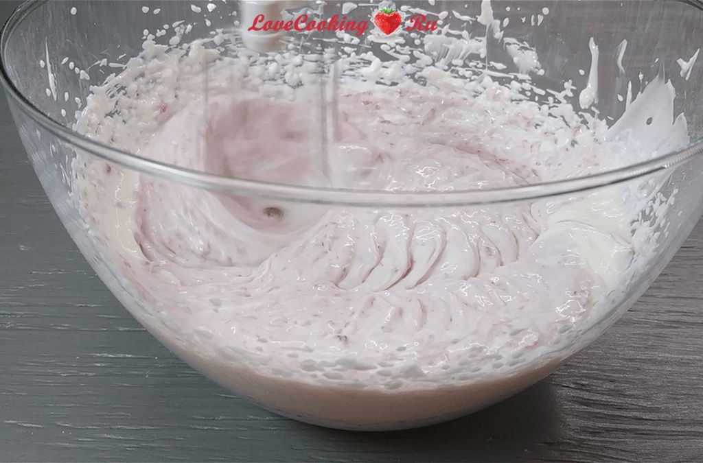 - С помощью миксера нужно взбивать содержимое в течение 7-8 мин, до образования густой и воздушной массы.