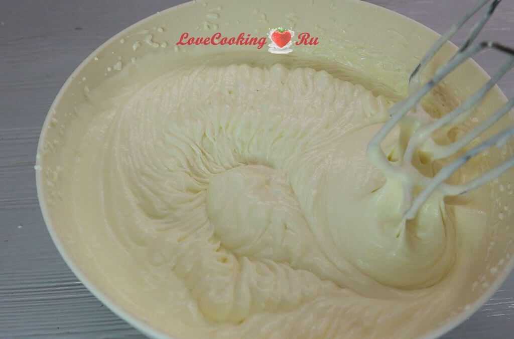 Взбивать стоит не менее, чем десять минут. За это время сахарные кристаллики полностью растворятся, а крем приобретет небольшую пышность. После взбивания используем массу сразу, либо охлаждаем в холодильнике до момента применения.
