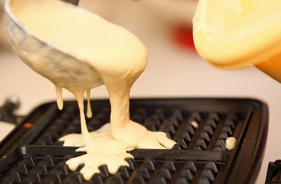 - После этого тесто выливают на сковородку или специальную вафельницу.