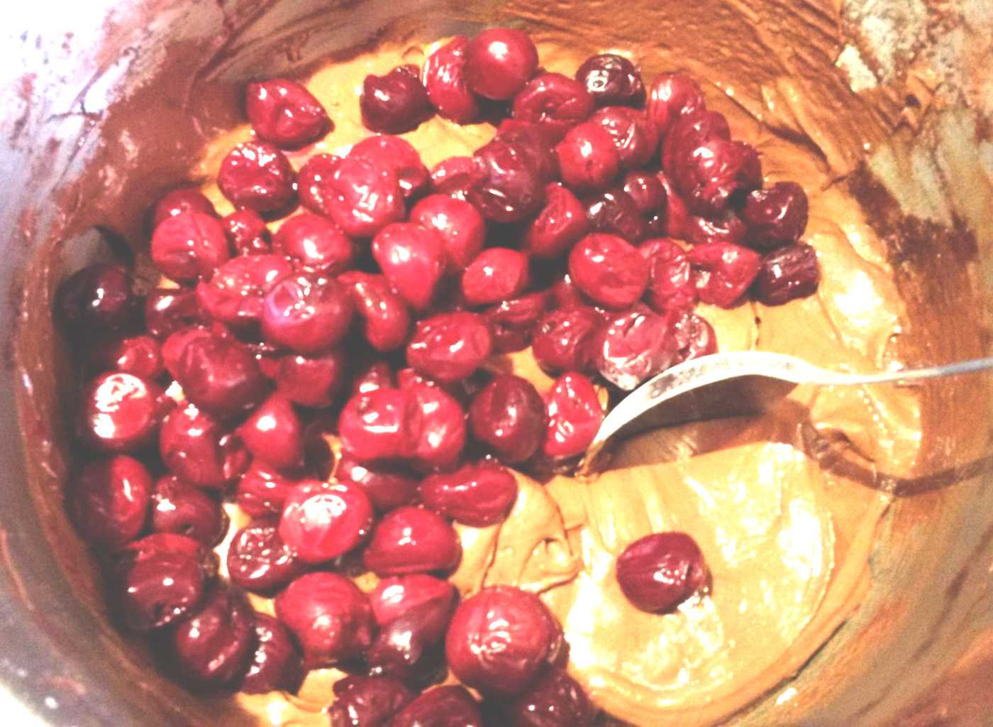 - Топим сливочное масло. Выливаем его в ёмкость с холодной водой, добавляем уксус. Выливаем в сухую смесь и хорошо перемешиваем венчиком до густой кофейной массы. Добавляем 300 г вишни, хорошо промытой без косточек.
