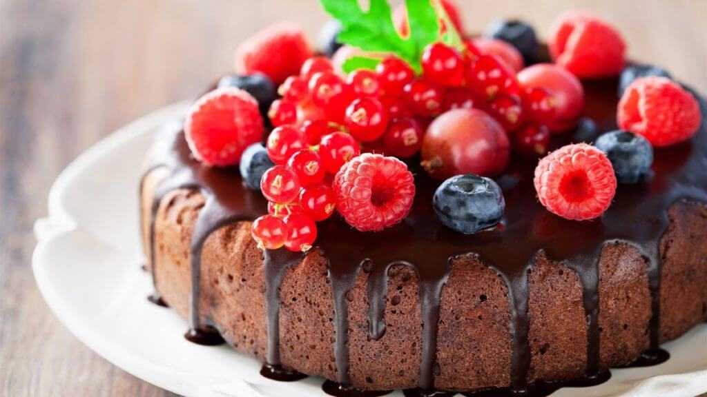 Разноцветные плоды можно выкладывать на шоколадную глазурь, взбитые сливки или хаотично создавая узор. Кондитерским шприцем создайте изящную кайму по краю кекса, а в середине выложите ягоды.