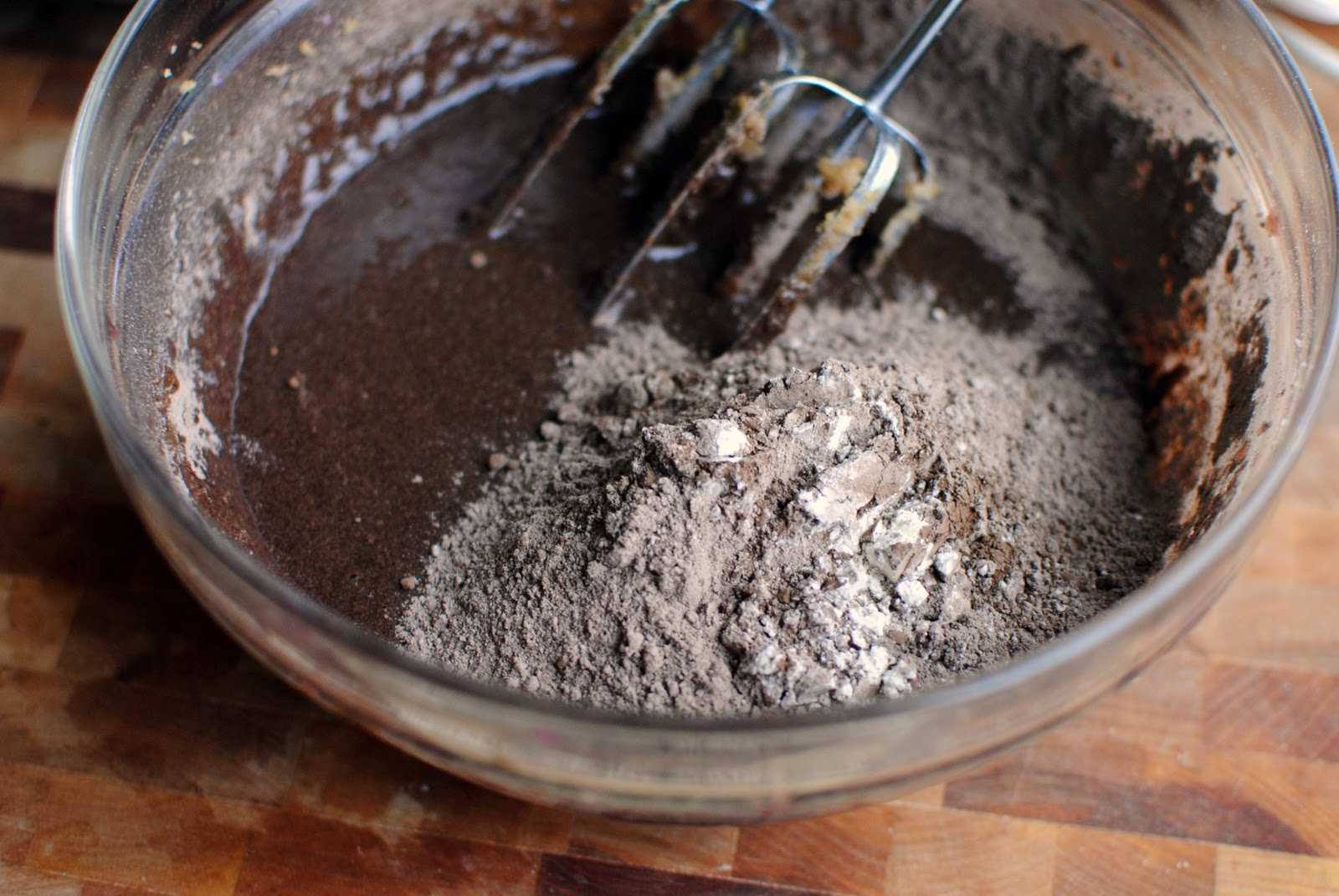 Отдельно смешиваем муку с какао и рыхлителем. Дважды просеиваем смесь через очень мелкое сито.