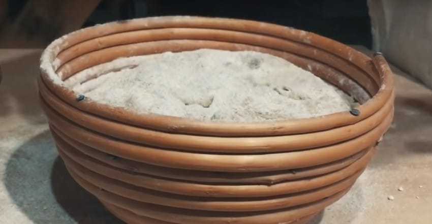 2. Возьмите любую форму, хорошо подпылите ее мукой изнутри. Когда тесто подойдет, сформируйте его и переложите в емкость. Оставьте замес на 1,5 часа, чтобы он окончательно подошел.