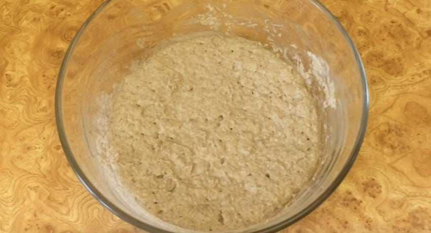 Следующий этап — замес теста. В миске смешиваем ингредиенты рецепта — опару, воду (или заменяющую жидкость) и муку. Всё! Больше ничего не добавляется. На этой стадии особо хороший замес не требуется, главное, хорошо всё смешать, чтобы не оставалось муки.