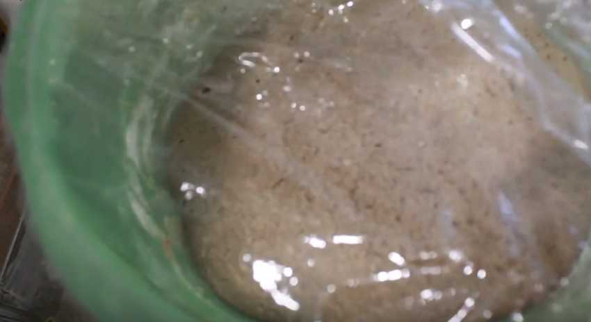 5. Верх заготовки разровняйте. Накройте емкость пленкой или полотенцем и дайте хлебу постоять в тепле (28-30оС) 40-60 минут.