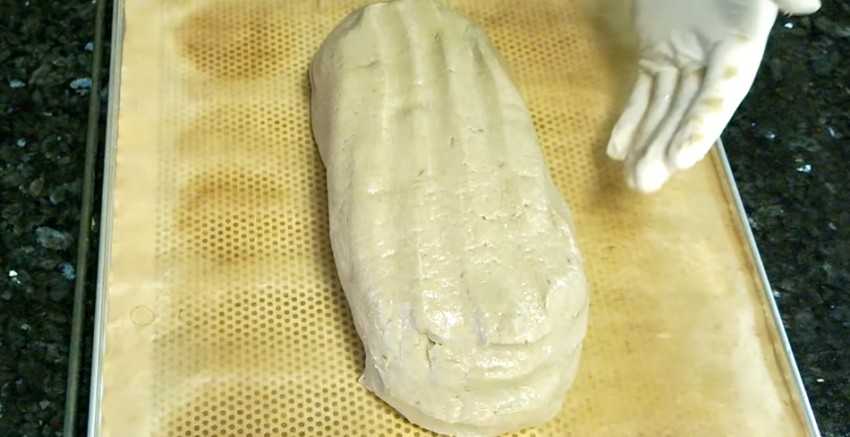 Замешивать тесто можно разными способами — растиранием, отбиванием, растягиванием и т.д. Каждый приходит к своему варианту. В интернете есть видео с самыми разными способами. Мне нравится вариант с растяжкой-отбиванием, вам, возможно, что-то другое. Ну, а если есть тестомес, то проблем с замесом вообще не бывает. В финале получаем тесто, не прилипающее к рукам, консистенции «мочки уха или попки младенца».