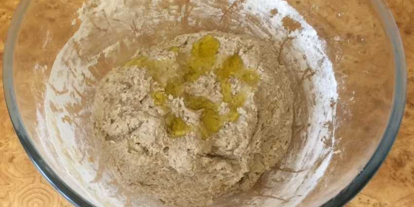 4. Добавьте оба вида муки и замесите тесто. Добавьте растительное масло и хорошо вымешайте, чтобы все масло впиталось.
