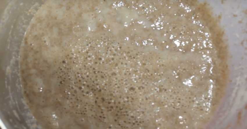 Опара готова, когда в ней образовалось много пузырьков и она увеличилась в объёме. Можно приступать к замесу теста.