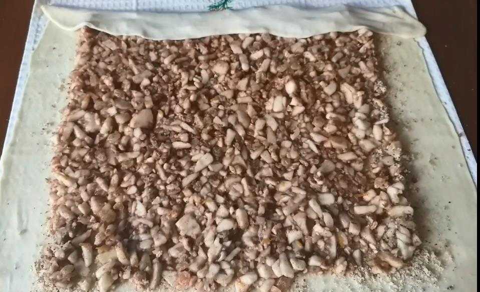 - Выкладываем по всему пласту начинку.