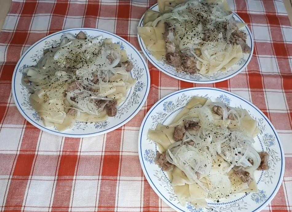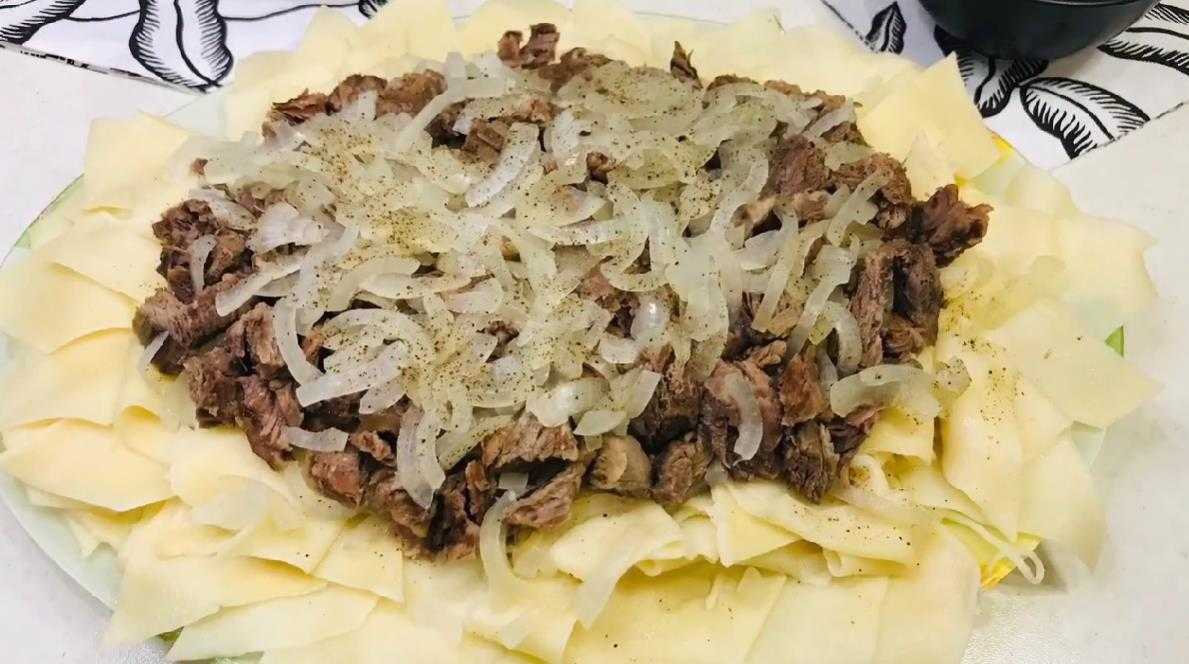 - Тесто на бешбармак положить на тарелку, выложить мясопродукты, посыпать луком и зеленью. Залить достаточным объемом бульона.