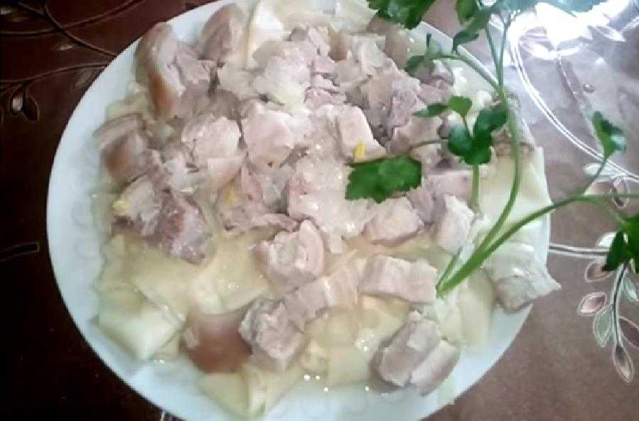 Варим пару минут. Все сразу мы не кладем. Только по несколько кусочков. Доводим их, вынимаем и кладем следующую порцию. Готовые лепешки вынимаем из отвара и перекладываем на подготовленное красивое блюдо. Постепенно мы заполняем ими все. Теперь будем собирать бешбармак. У нас есть мякоть, отделённая от кости, лепешки, а также соус из лука.