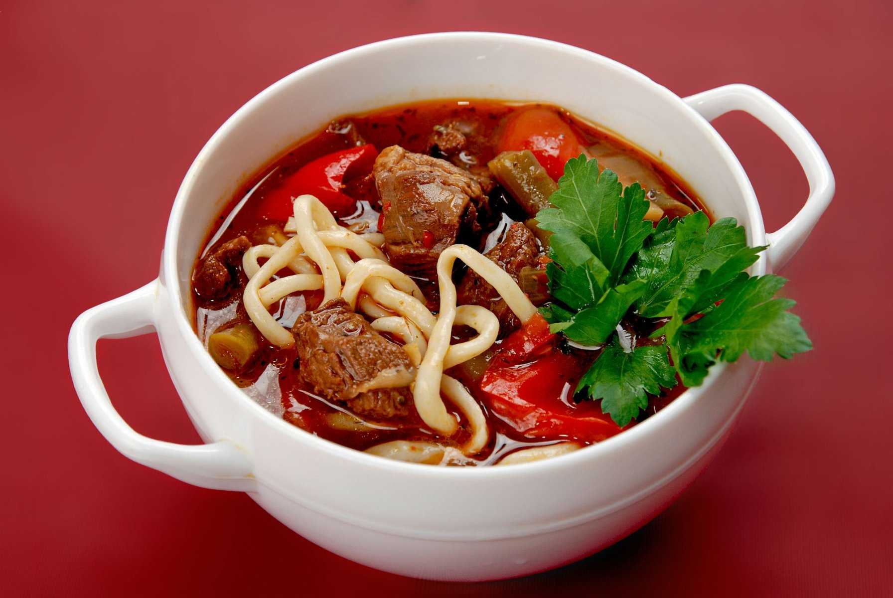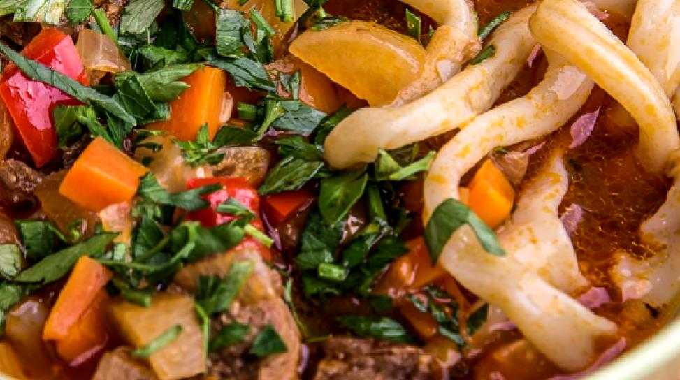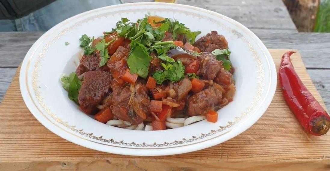 Чтобы лагман получался вкусным, острым, наваристым — отборное мясо и большое количество овощей сначала обжариваются, потом тушатся в собственном соку и после этого медленно томятся в бульоне. Также в нем должно быть много специй и зелени.