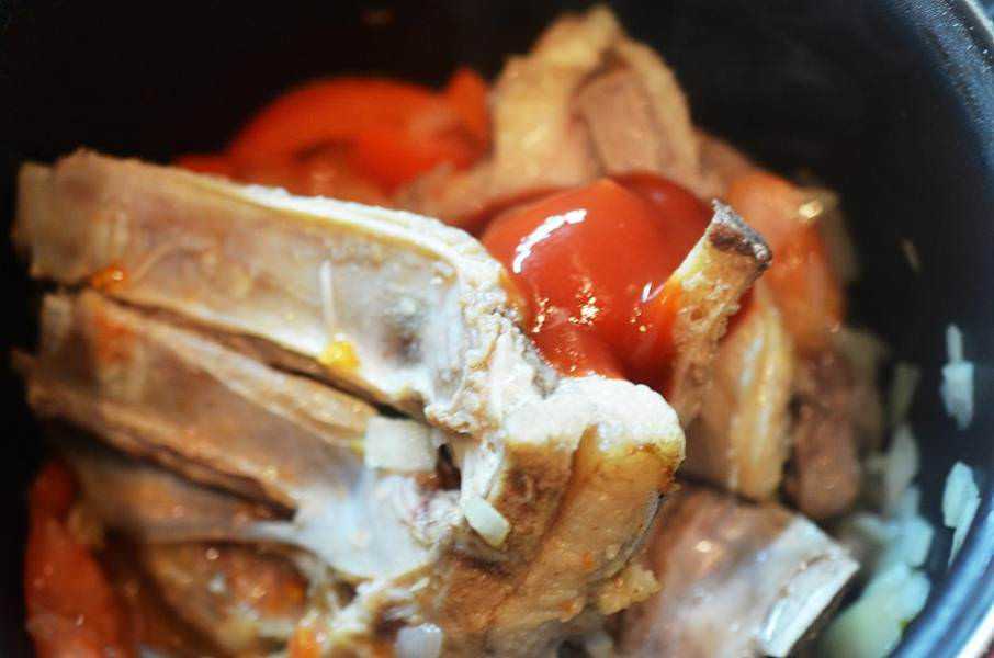 - После окончания обжарки добавить картофель, помидоры, перец, добавить воды и посолить, поперчить по вкусу.