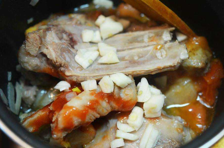 Когда мясо хорошо протушится, всыпать в мультиварку сельдерей, морковку, лук. После того как овощи спассеруются, добавить картофель с перцем. Сдобрить блюдо солью, перцем, специями, добавить помидорную пасту. Хорошо все размешать. Залить продукты водой, согласно своим предпочтениям густоты. Готовить лагман из курицы в режиме «Тушение» 1,5 часа.