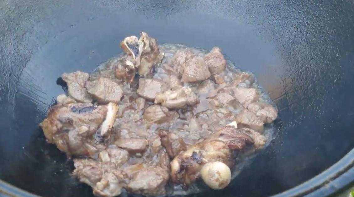 - В казане растапливаем курдючный жир, нарезанный кубиком. Убираем шкварки шумовкой. Нарезанную кубиком говядину закладываем в казан. Обжариваем.