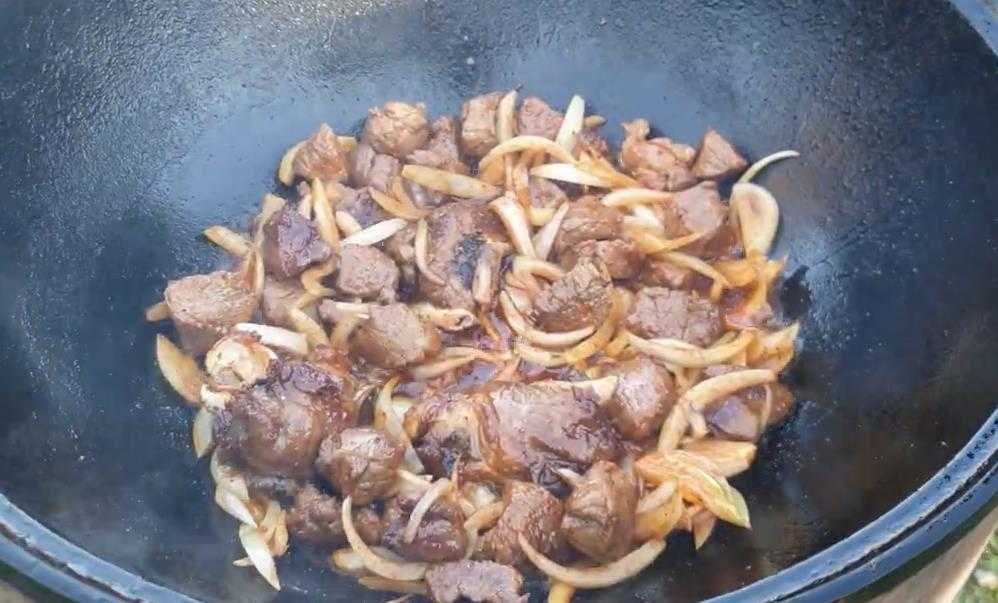 - Помешивайте содержимое в течение 5-7 минут и жарьте до мягкости мяса.