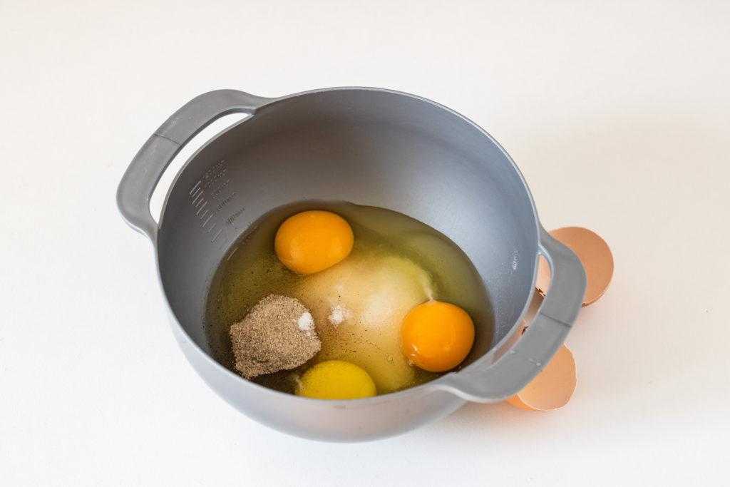4. В чашу для взбивания разбиваем яйца. Добавляем к ним щепотку соли.