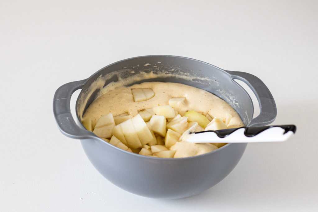 Этот способ называют самым быстрым и простым. И все потому, что кусочки фруктов просто перемешиваются с тестом. Не надо тратить время и выкладывать их красивым рисунком. Перемешали с тестом и в духовку.