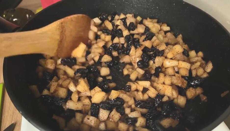 Если есть такая возможность, стоит переложить кусочки яблок в сковородку, где заранее было растоплено сливочное масло, после чего кусочки обжаривают до готовности. Также стоит добавить к этой массе сахарный песок, чтобы яблоки карамелизовались. В отдельной миске перемешивают дробленые орешки и пару ложек панировочных сухарей.