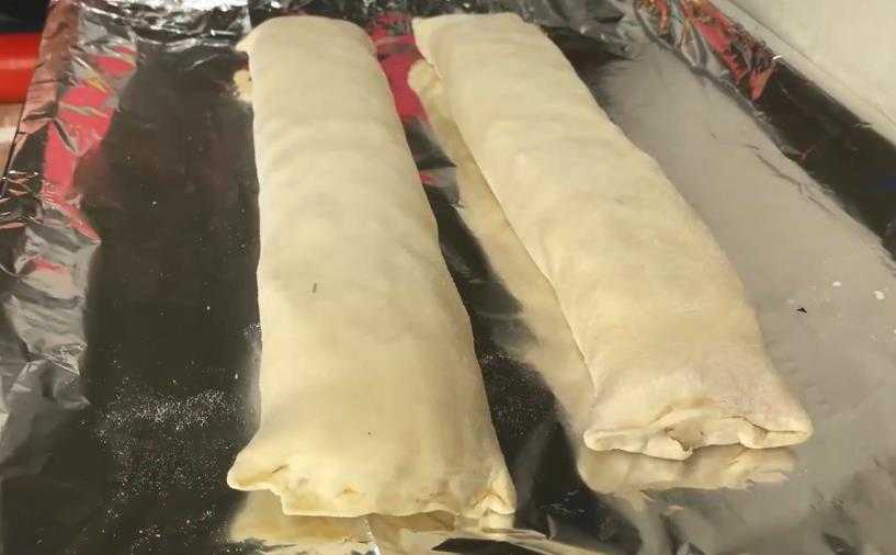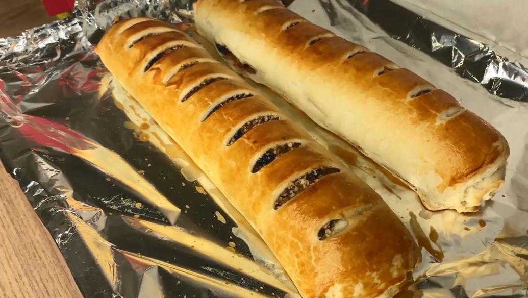 Из двух пластов теста скатывают два одинаковых рулета, указанное количество начинки рассчитано именно на два пласта теста. Концы рулетиков закрепляют наверху, чтобы из начинки не выливался сок во время запекания.