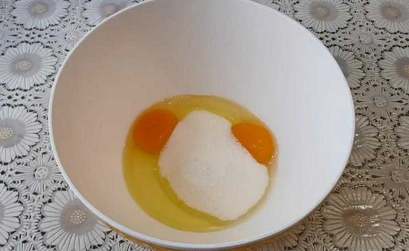 1. Берем большую чашу, в которой будем готовить тесто. Разбиваем 2 яйца и венчиком хорошенько взбалтываем белки с желтками.