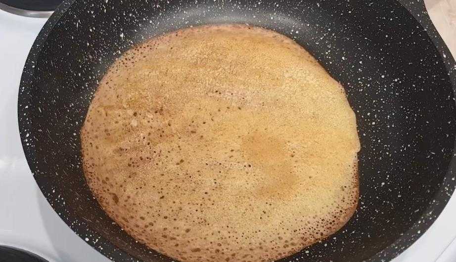 5. Через 15 секунд переворачиваем полу готовый блинчик при помощи кулинарной лопатки ил ножа с широким лезвием на другую сторону и томим еще секунд 5-10.