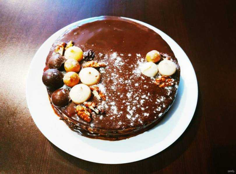 Перемажьте кремом все слои, а сверху полейте шоколадным топингом, или шоколадной глазурью. Дайте торту настояться несколько часов, а лучше ночь, украсьте и подавайте к столу.