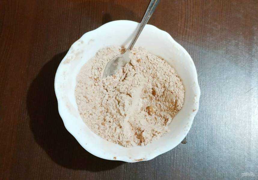 Смешать в другой миске 100 г муки с 1 ст. ложкой крахмала и добавить в тесто. Перемешать до однородной массы.