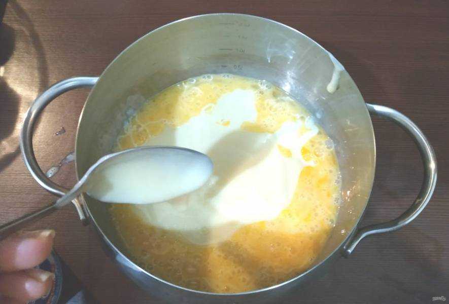 Тесто в оригинальном рецепте готовится на водяной бане. Закипятить воду в кастрюле, сверху поставить миску, в которой будете делать тесто. Вода под миской должна все время потихоньку кипеть.