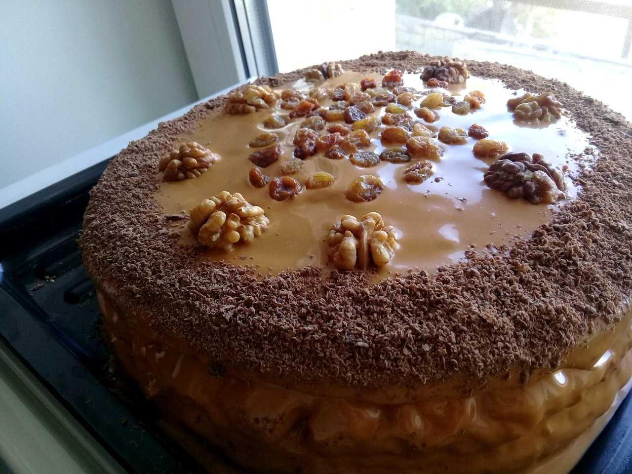 Собираем торт. Коржи можно сложить в любой последовательности. На блюдо положите первый корж (у меня корж с грецкими орехами). Смажьте его кремом. Сверху положите второй корж (у меня с изюмом). Также промажьте его кремом. И далее последний корж (у меня с маком). Смажьте кремом верх и бока торта. Украсить можно по своему желанию. Я украсила грецкими орехами, изюмом и тертым шоколадом. Отправить торт в холодильник на 5-6ч пропитаться. Приятного чаепития!