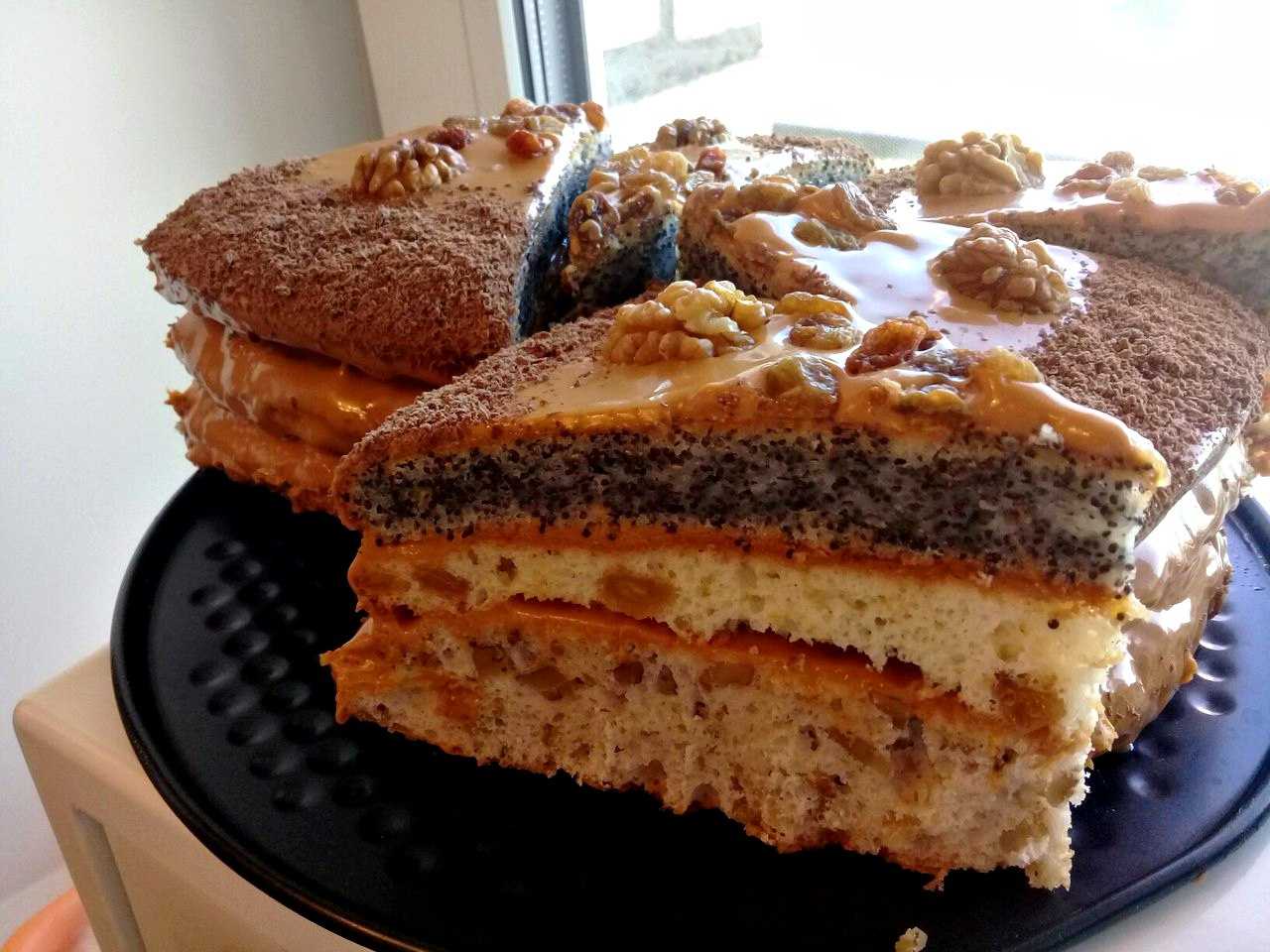 Торт “Мудрый еврей”. или «Бедный еврей». или «Старый еврей». В любом случае, это моя легкая вариация на тему этого классического домашнего торта. Здесь я заменила содовый кефирный бисквит на классический бисквит на яйцах — он и легче по текстуре, и благороднее по вкусу, и форма у него лучше, без горба. Крем — всё та же сгущенка с маслом и сметаной. Наполнители — тоже традиционные — мак, орехи и курага. В общем, если вы еще не пробовали этот торт — попробуйте. Это по-добротному вкусно.