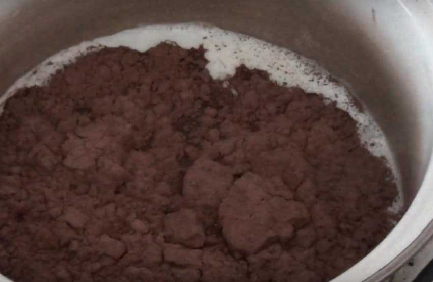 - Для декорирования торта приготовим шоколадную глазурь. В небольшой кастрюле соединяем какао-порошок, сметану и сахар-песок. Ставим кастрюлю на небольшой огонь и варим до полного растворения всех ингредиентов. Не забываем все время помешивать. Готовую глазурь остужаем при комнатной температуре.