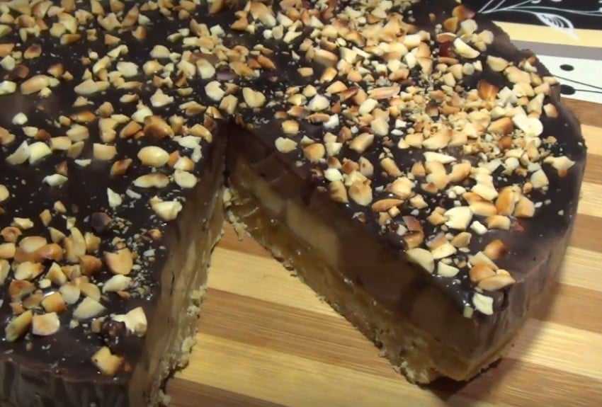 Застывший торт достаньте из холодильника и равномерно распределите помадку. Присыпьте готовое блюдо остатками измельченного арахиса и отправьте еще на 5 минут в холодильник до застывания помадки.