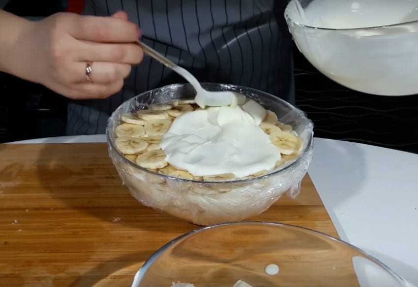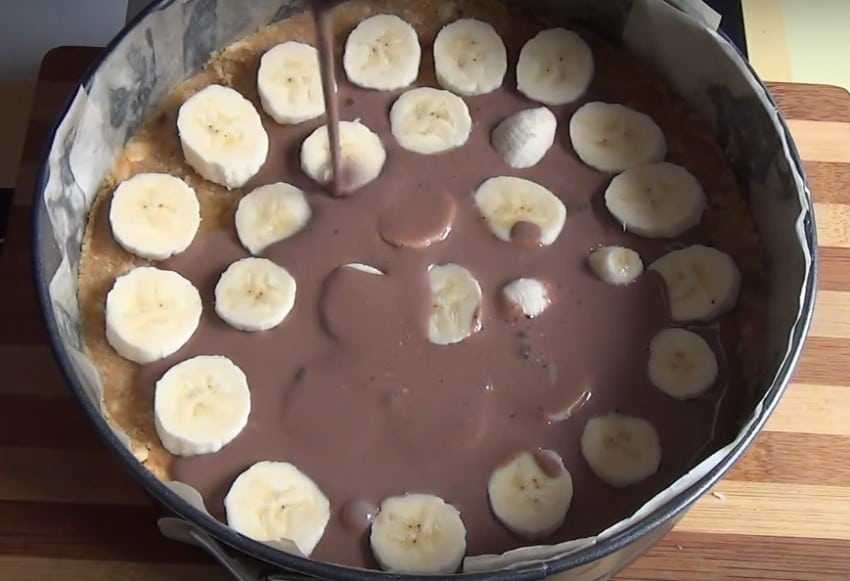 7. Извлеките из холодильника форму и в один слой переложите на нее бананы. Сверху аккуратно вылейте сметано-шоколадный крем. Снова поставьте в холодильник на 1-2 часа до застывания желатина.