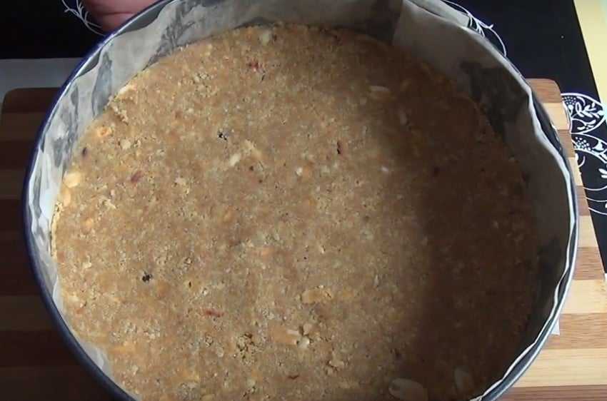 4. Возьмите форму или любую емкость с плоским дном и высокими бортиками и переложите в нее основу. Примните ложкой массу до получения плотного коржа. Уберите в холодильник на 5-10 минут для застывания.