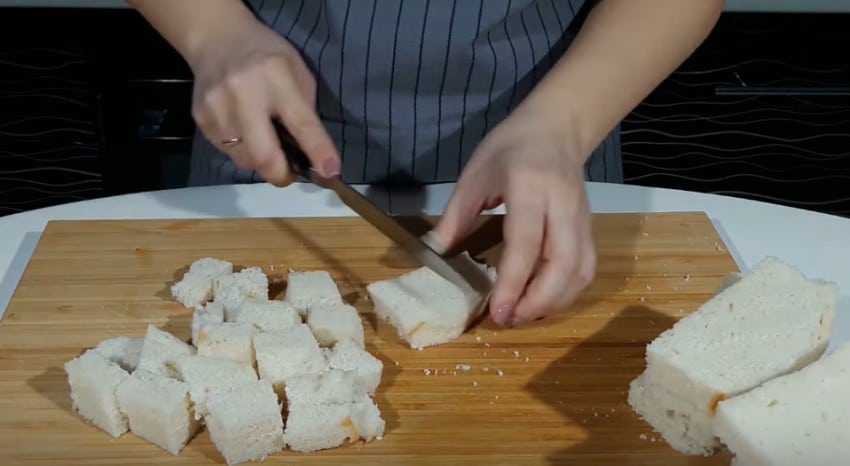 - Готовые бисквиты нарезаем кубиками небольшого размера.