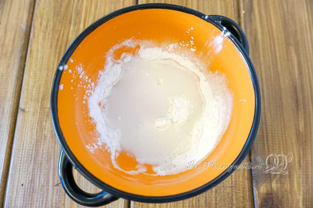 Засыпьте в дежу 375 г муки. Затем возьмите 165 мл воды, растворите в ней 2 г соли и 2 г лимонной кислоты. Лимонная кислота делает тесто мягким и эластичным. Мы растворяем соль и кислоту в воде, чтобы быть уверенными, что они полностью вступят во взаимодействие с тестом, не останутся где-то комочками.