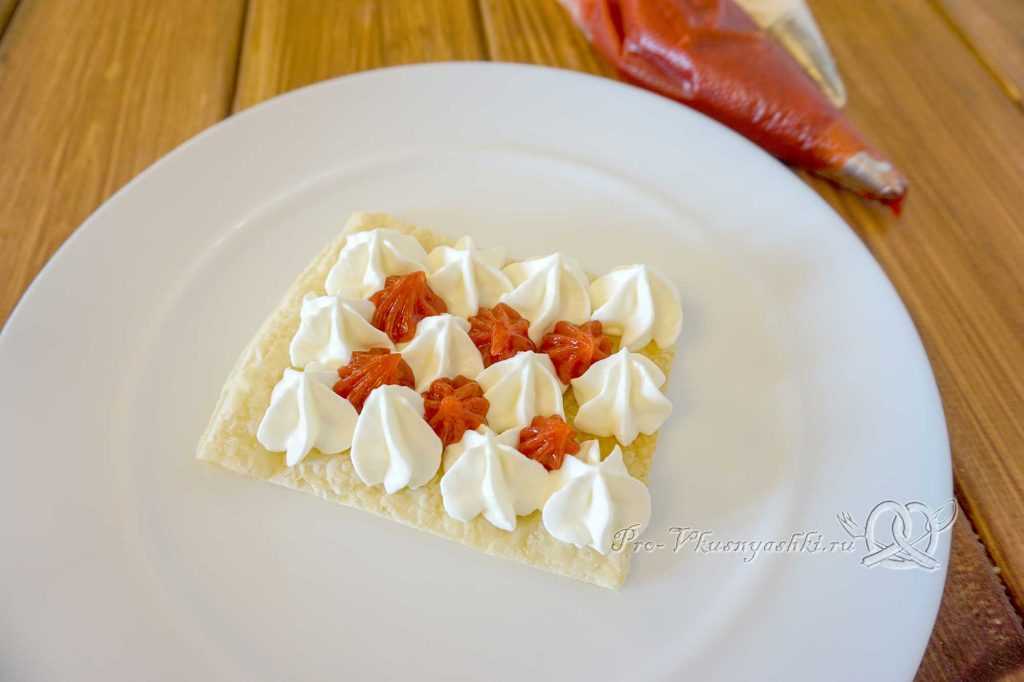 - Кладем первый кусок слоеного теста, выдавливаем на него 3 толстые полоски крема из кондитерского мешка.