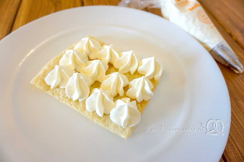 Обратите внимание: ведущая для сборки десерта использует кулинарный шприц, это позволяет сделать пирожное мильфей очень нарядным, поскольку крем не намазывается на коржи, а выкладывается на них «кучками». Это выглядит безумно красиво и дорого, как в шикарном ресторане, и, кроме того, такая подача делает десерт совсем не похожим на слегка скучноватый и привычный «Наполеон»