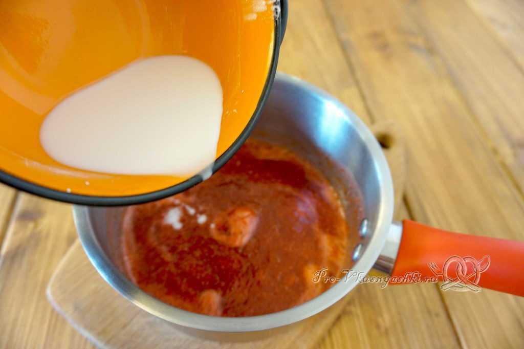 Уваривайте на среднем огне, пока благодаря крахмалу масса не начнет густеть.