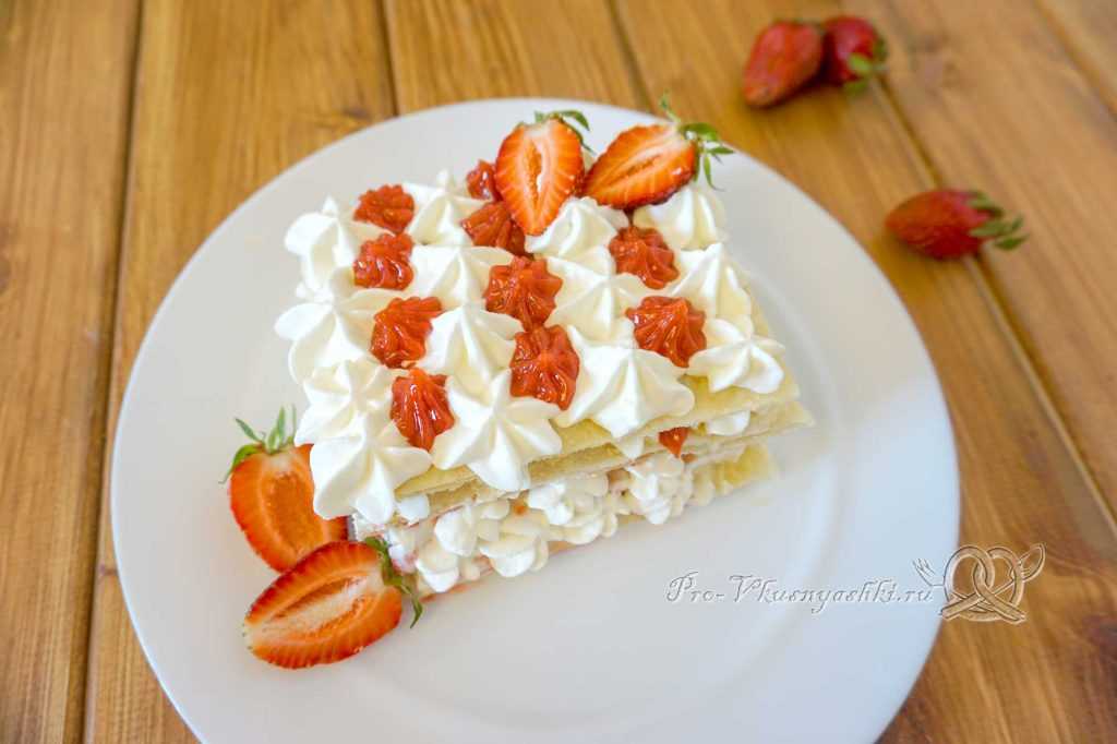 - Отличительная черта Мильфея от Наполеона — слои испеченных коржей смазывают не только кремом, но и прокладывают любыми свежими ягодами: клубникой, ежевикой, малиной, черникой и т. д. Замороженные плоды предварительно оттаивают, а сок сливают. Консервированные фрукты не подходят, т.к. они быстро размочат тесто.