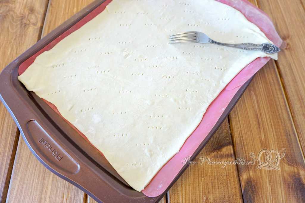 - Лист слоеного теста весом 350-400 г раскатываем на листе пергаментной бумаги до толщины 3-4 мм и выкладываем на антипригарный противень или перемещаем вместе с бумагой на обычный.