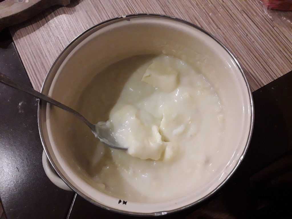Постоянно помешивая венчиком доводим ее до загустения. В конце добавляем ванилин и сливочное масло.