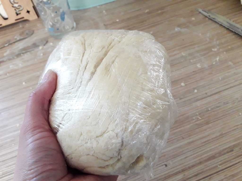 Заверните готовое тесто в пищевую пленку или целлофановый пакет отправьте на часик в холодное место.
