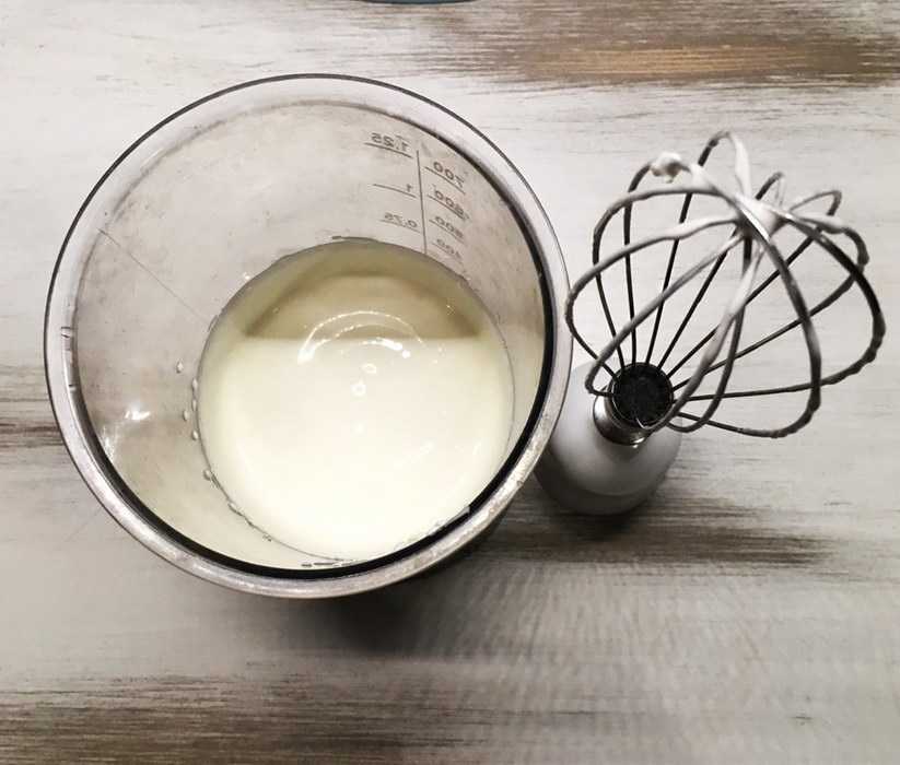 Не останавливая процесс взбивания, необходимо медленно влить кефир, взбить все вместе на протяжении 1 мин.