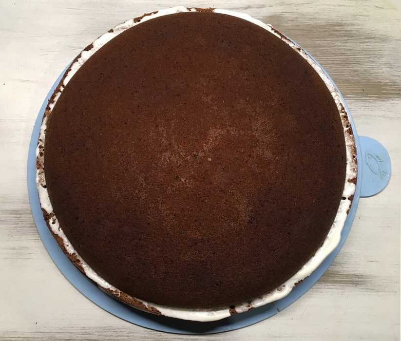 - Спёкшийся корж достаём с духовки и даём остыть. Извлекаем из формы и разрезаем ножом на две части. Укладываем первую часть коржа на плоское блюдо и смазываем кремом. Сверху уложим вторую половинку коржа и выкладываем оставшийся крем (сверху и по бокам).