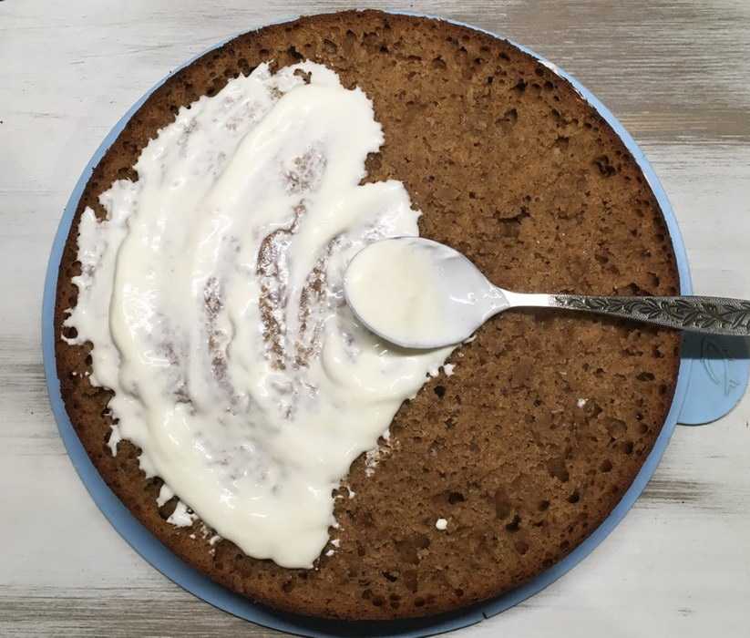 - Готовые коржи пропитываются сиропом и щедро перемазываются сметанным кремом со всех сторон.