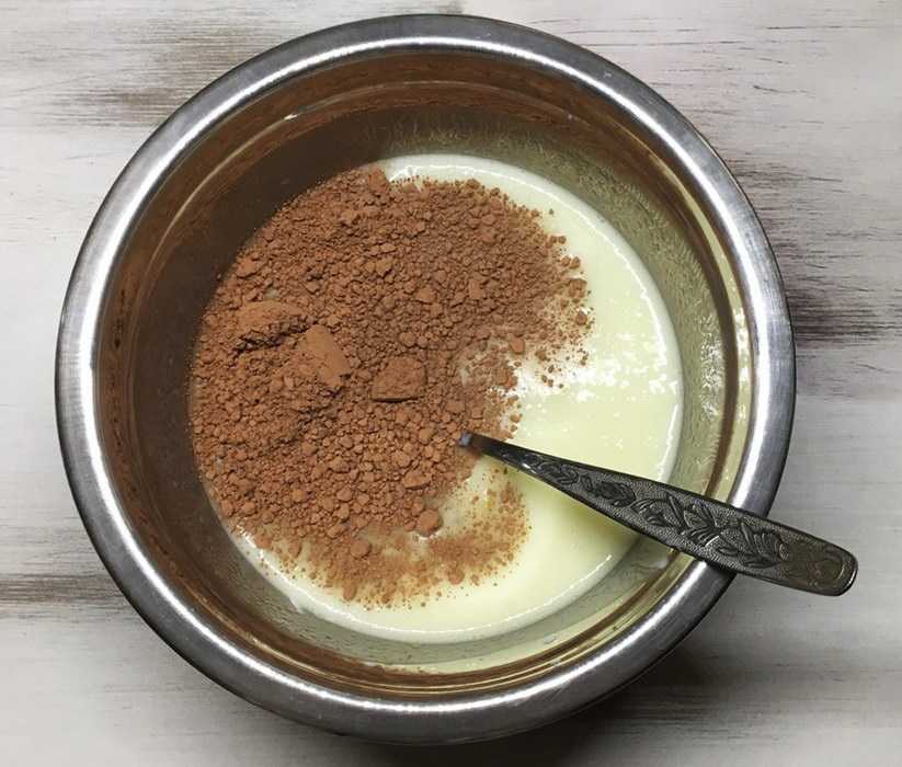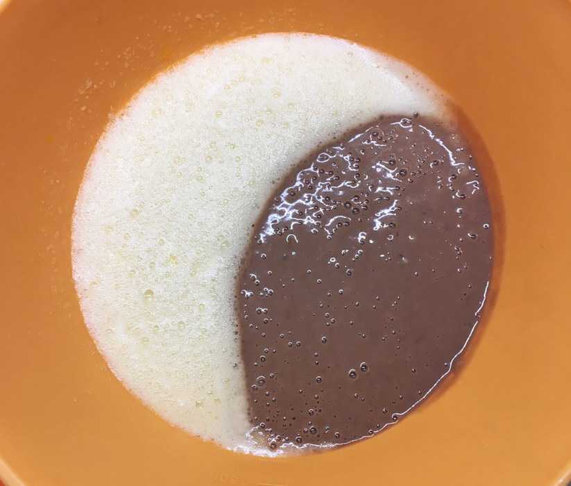 - Смешиваем обе желтковую и белковую смесь в глубокой миске и добавляем 1 ст. л. какао. Хорошо перемешиваем, чтобы не осталось комочков.